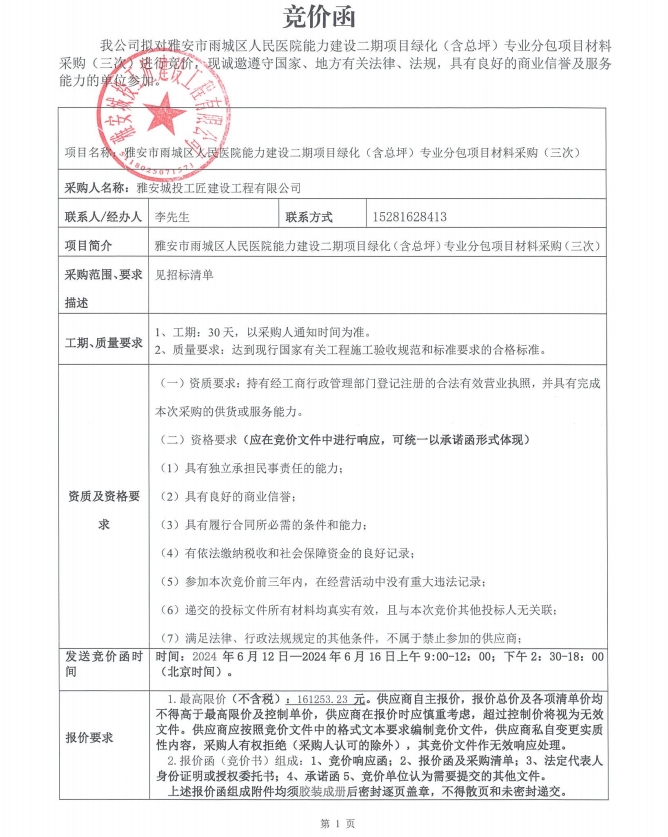 雅安市雨城區(qū)人民醫(yī)院能力建設(shè)二期項目綠化(含總坪)專業(yè)分包項目材料采購(三次)競價公告