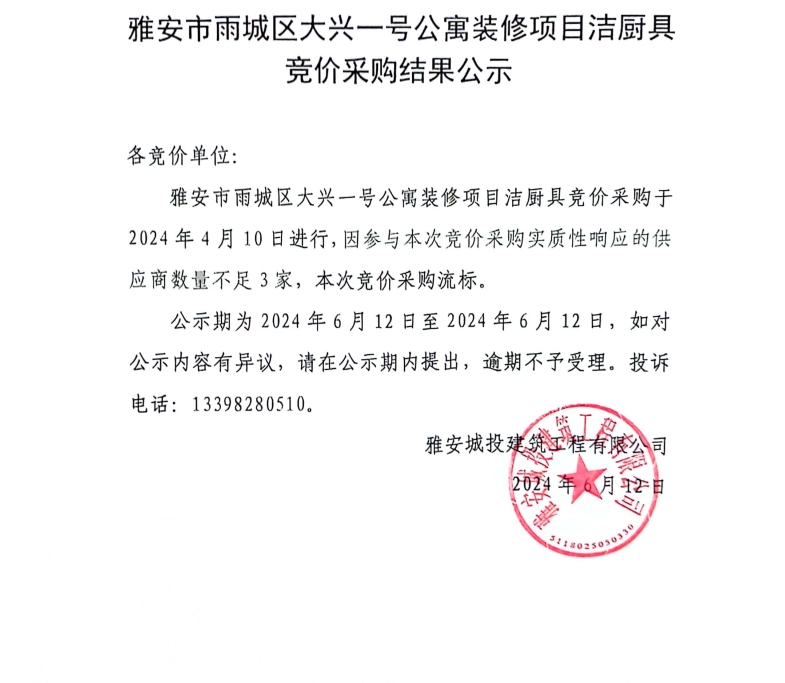 雅安市雨城區(qū)大興壹號(hào)公寓裝修項(xiàng)目潔廚具競(jìng)價(jià)采購結(jié)果公示