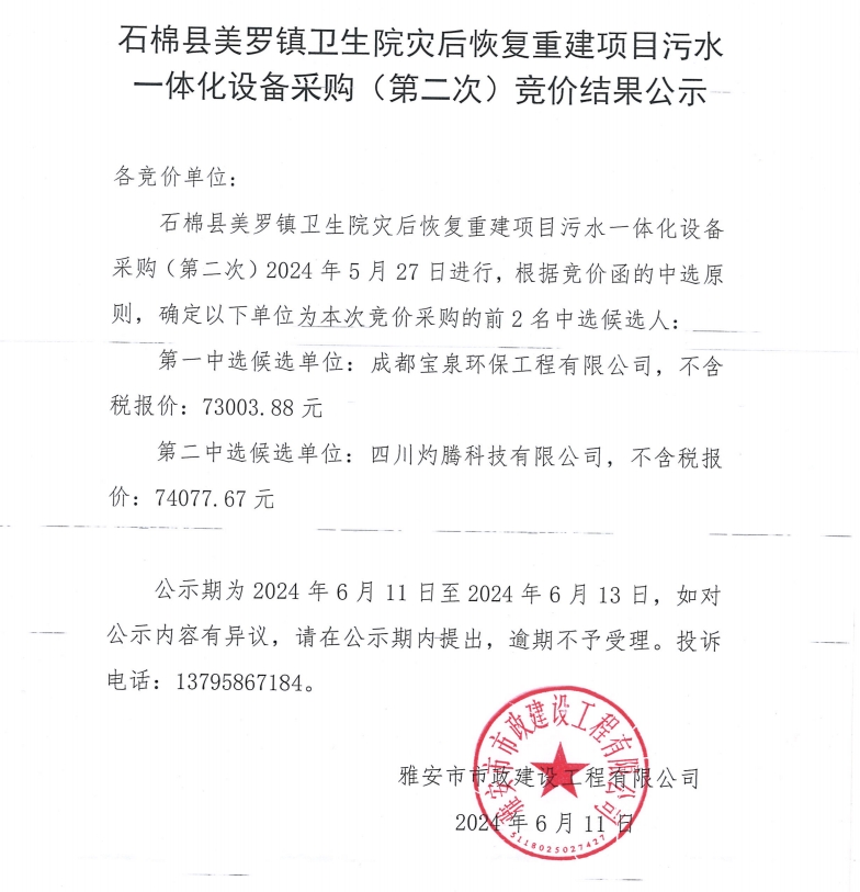 石棉縣美羅鎮(zhèn)衛(wèi)生院災(zāi)后恢復(fù)重建項(xiàng)目污水一體化設(shè)備材料采購(第二次)競(jìng)價(jià)結(jié)果公示