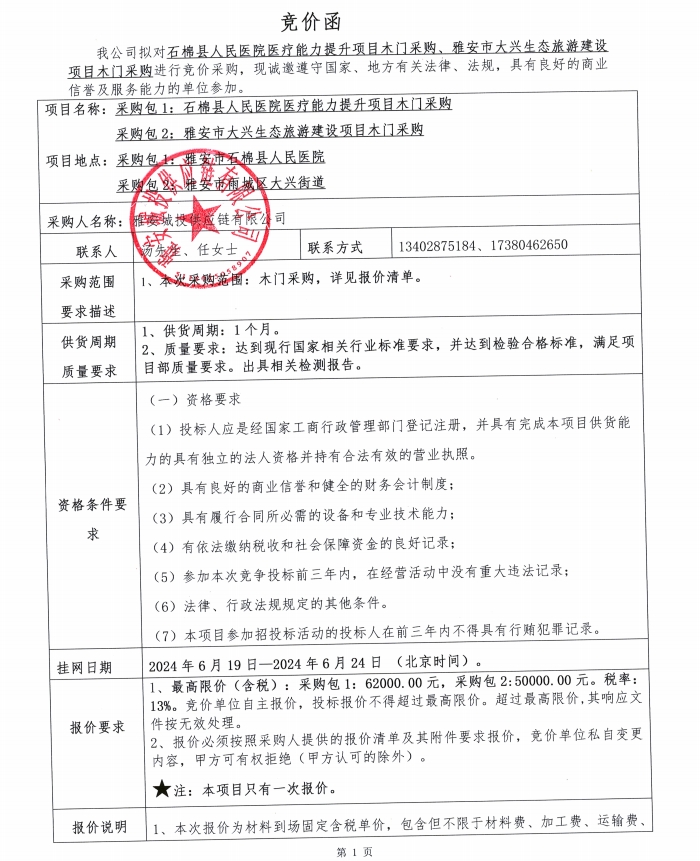 石棉縣人民醫(yī)院醫(yī)療能力提升項(xiàng)目木門采購、雅安市大興生態(tài)旅游建設(shè)項(xiàng)目木門采購競價(jià)公告