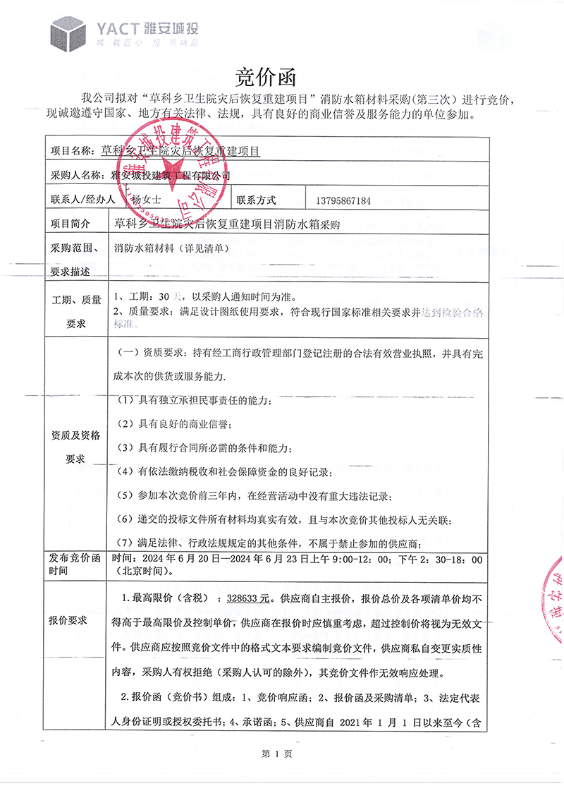 草科鄉(xiāng)衛(wèi)生院災(zāi)后恢復(fù)重建項(xiàng)目消防水箱(第三次)采購競價(jià)函