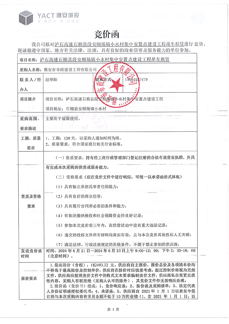 瀘石高速石棉縣段安順場鎮(zhèn)小水村集中安置點建設(shè)工程吊車租賃競價函
