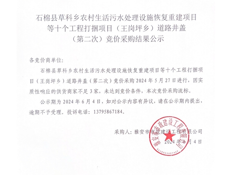 石棉縣草科鄉(xiāng)農(nóng)村生活污水處理設(shè)施恢復(fù)重建項(xiàng)目等十個(gè)工程打捆項(xiàng)目(王崗坪鄉(xiāng))道路井蓋(第二次)競價(jià)采購結(jié)果公示