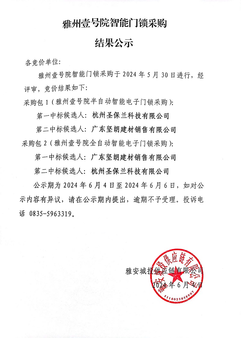 雅州壹號(hào)院智能門鎖采購(gòu)結(jié)果公示