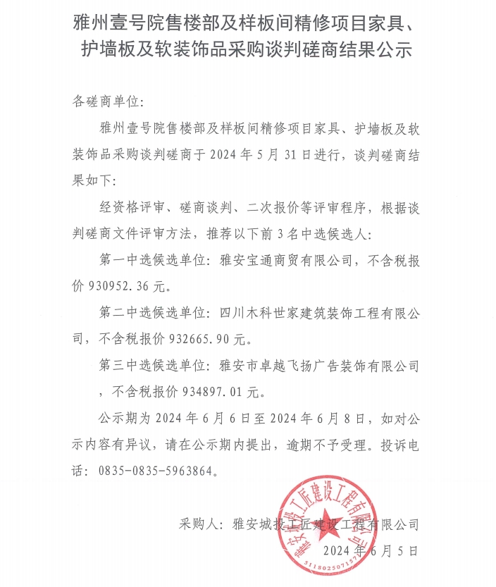 雅州壹號院售樓部及樣板間精修項目家具、護墻板及軟裝飾品采購談判磋商結(jié)果公示