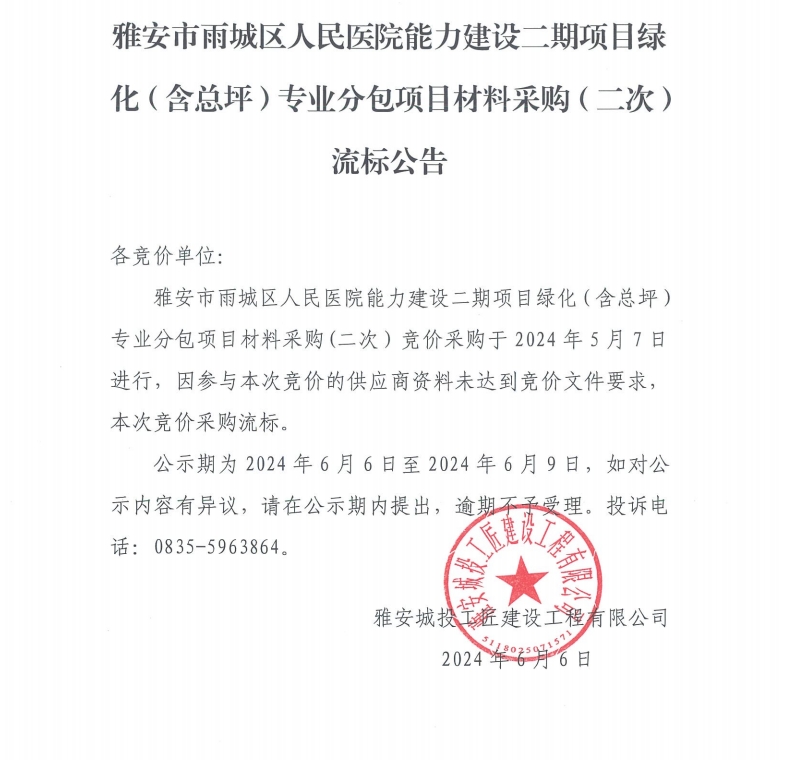 雅安市雨城區(qū)人民醫(yī)院能力建設(shè)二期項(xiàng)目綠化(含總坪)專業(yè)分包材料采購(二次)流標(biāo)公告