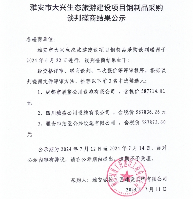 雅安市大興生態(tài)旅游建設(shè)項(xiàng)目鋼制品采購(gòu)談判磋商結(jié)果公示