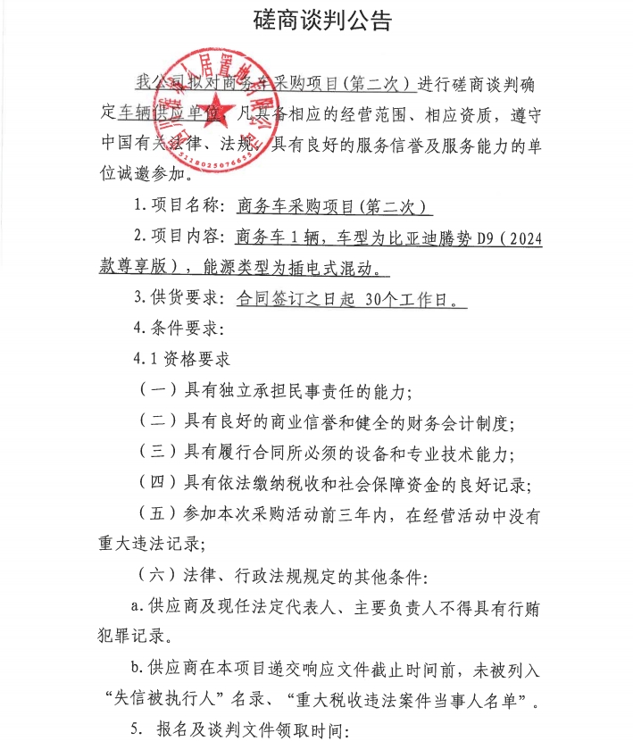 商務車采購項目(第二次)磋商談判公告