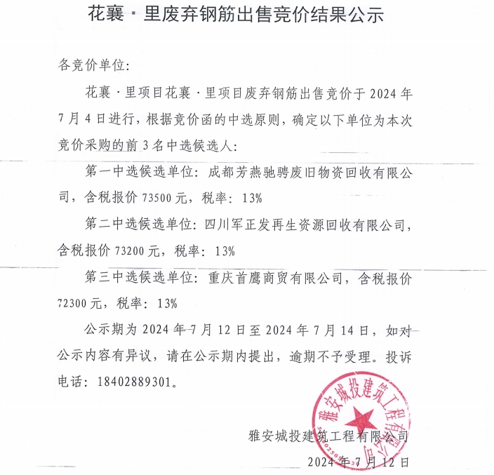 花襄·里廢棄鋼筋出售競(jìng)價(jià)結(jié)果公示