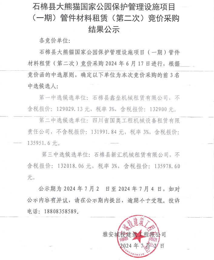 石棉縣大熊貓國家公園保護(hù)管理設(shè)施項(xiàng)目(一期)管件材料租賃(第二次)競(jìng)價(jià)采購結(jié)果公示