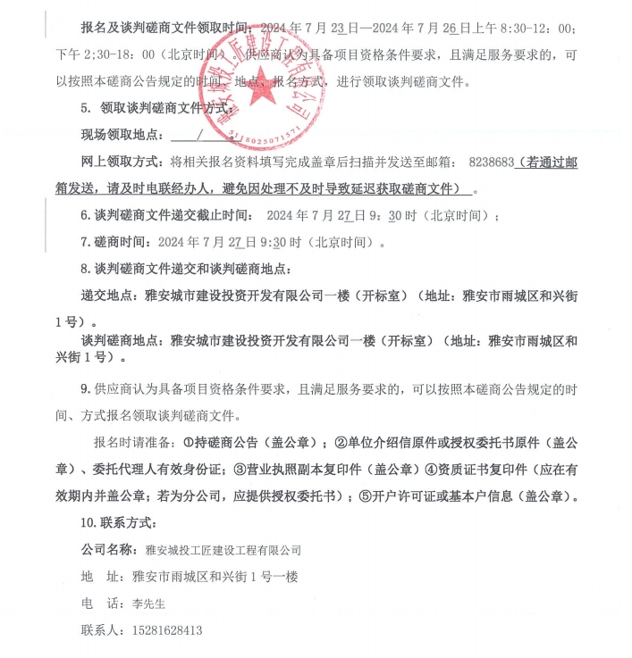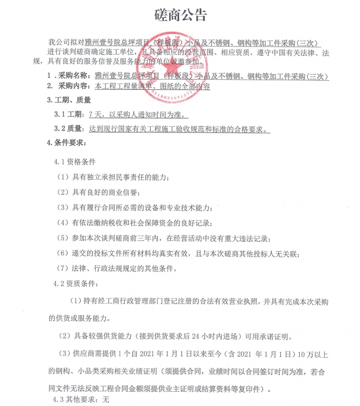 雅州壹號院總坪項目(樣板段)小品及不銹鋼、鋼構等加工件的采購(三次)磋商公告