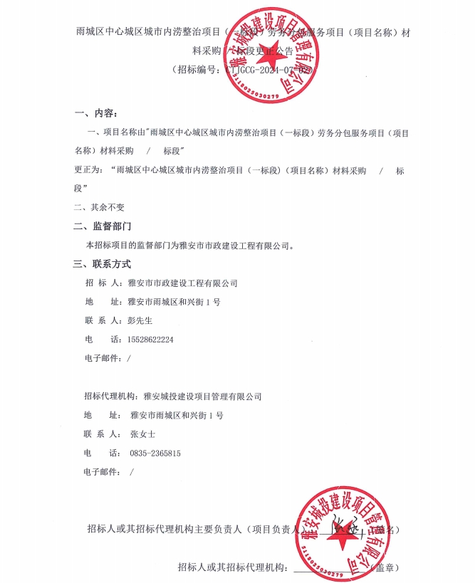雨城區(qū)中心城區(qū)城市內(nèi)澇整治項(xiàng)目(一標(biāo)段)勞務(wù)分包服務(wù)項(xiàng)目(項(xiàng)目名稱(chēng))材料采購(gòu)/標(biāo)段更正公告
