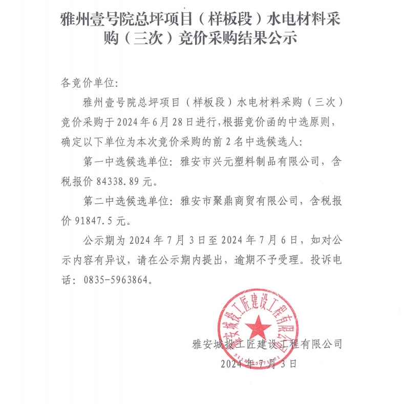 雅州壹號院總坪項目(樣板段)水電材料采購(三次)競價采購結(jié)果公示