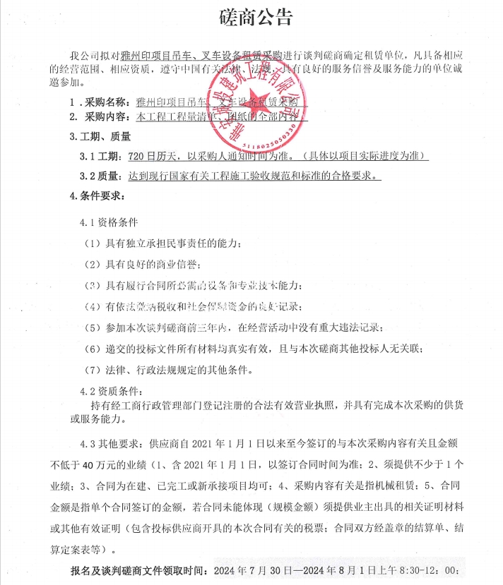 雅州印項(xiàng)目吊車(chē)、叉車(chē)設(shè)備租賃采購(gòu)談判磋商公告