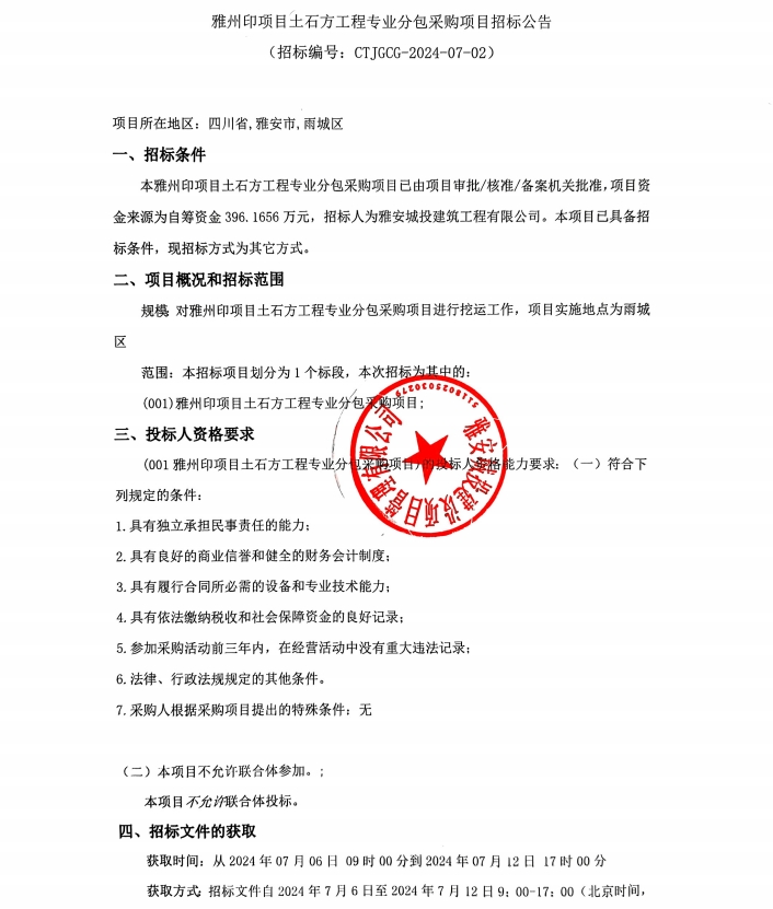 雅州印項(xiàng)目土石工程專業(yè)分包采購(gòu)項(xiàng)目招標(biāo)公告