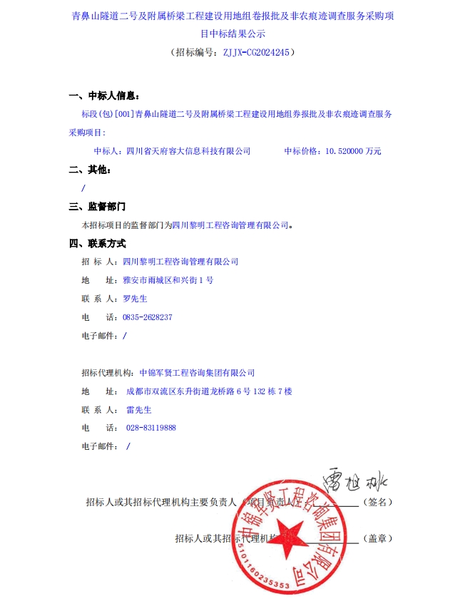 青鼻山隧道二號及附屬橋梁工程建設(shè)用地組卷報批及非農(nóng)痕跡調(diào)查服務(wù)采購項目中標結(jié)果公示