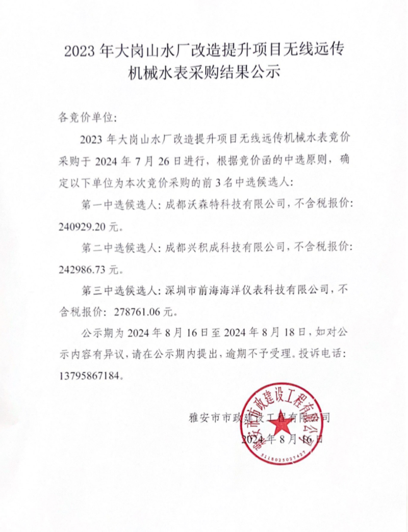 2023年大崗山水廠改造提升項目無線遠傳機械水表采購結果公示