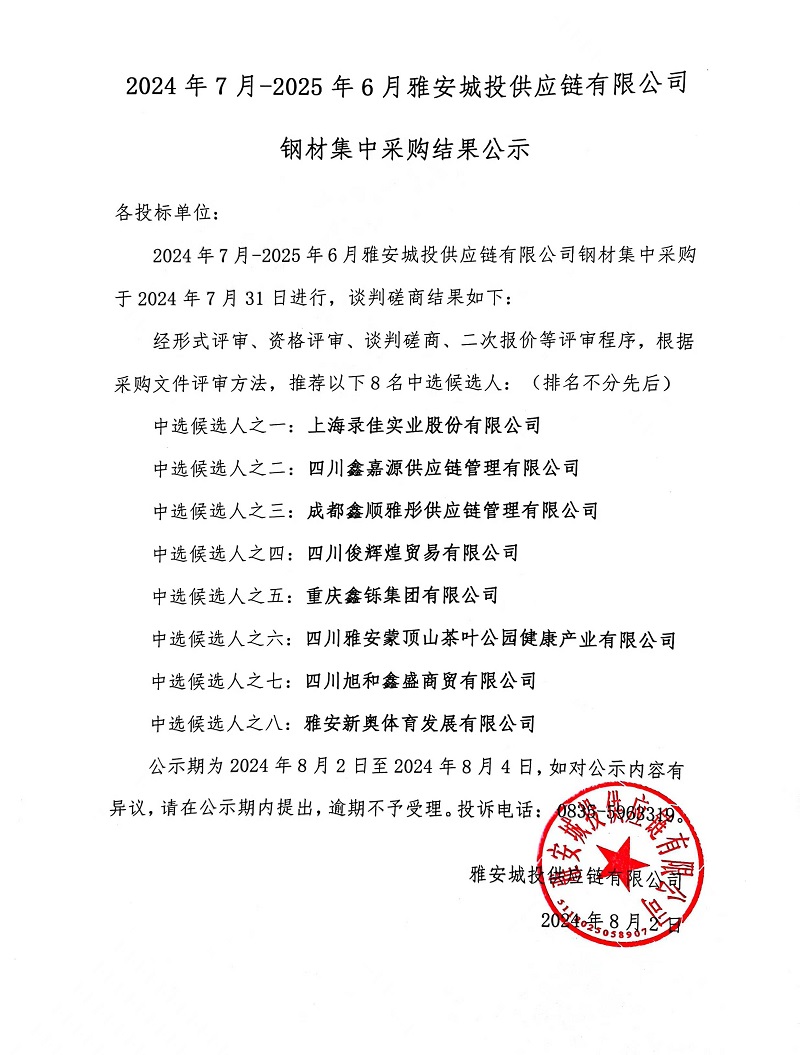 2024年7月-2025年6月雅安城投供應鏈有限公司鋼材集中采購結(jié)果公示