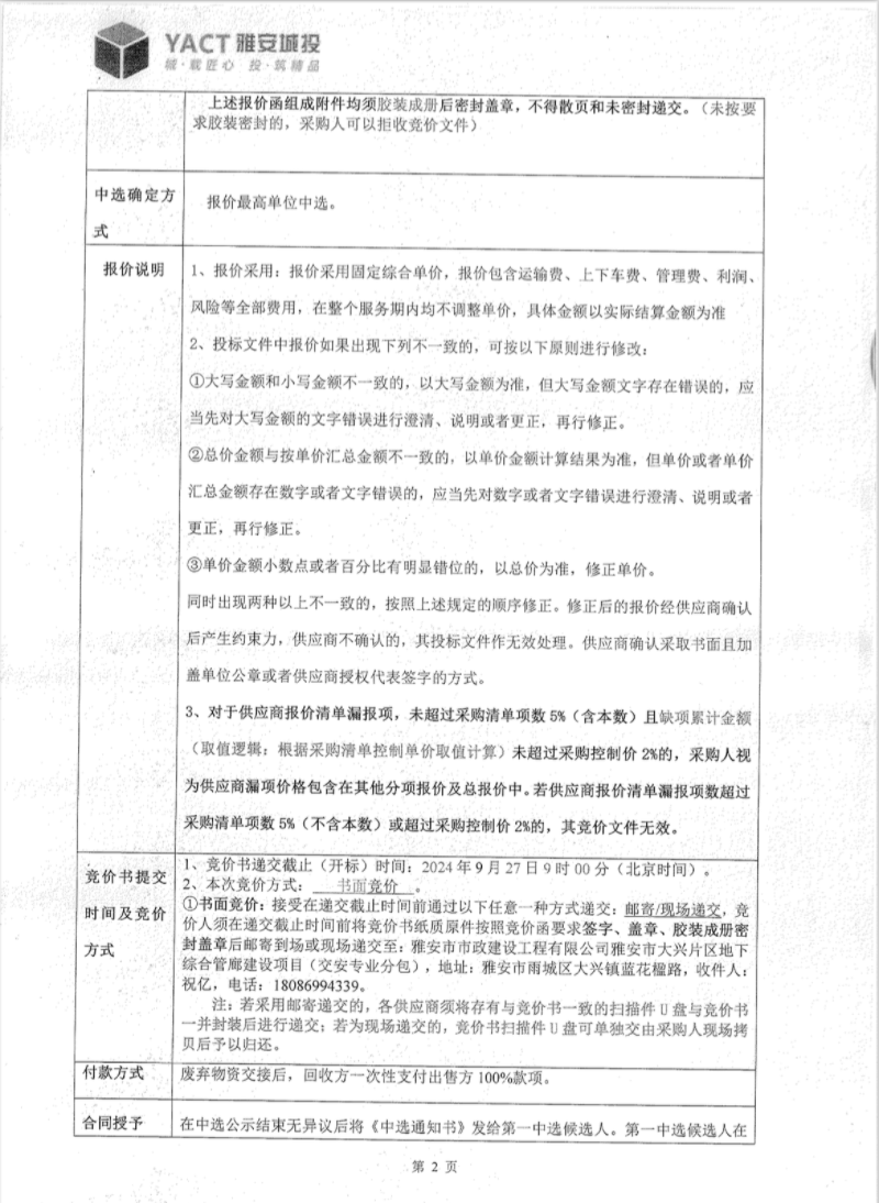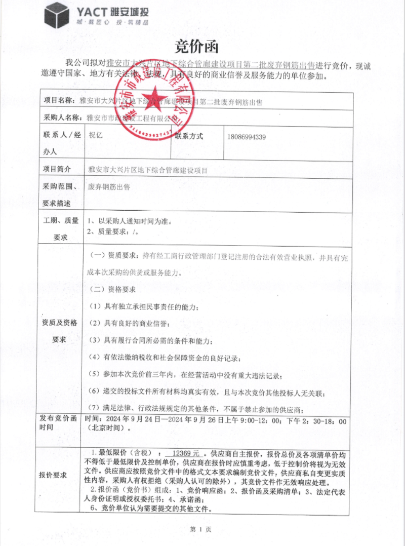 雅安市大興片區(qū)地下綜合管廊建設(shè)項(xiàng)目第二批廢棄鋼筋出售競價(jià)公告