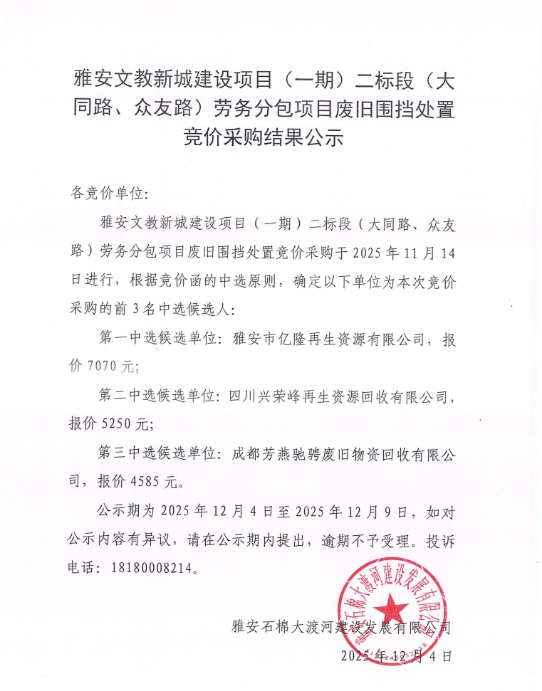 雅安文教新城建設(shè)項(xiàng)目(一期)二標(biāo)段(大同路、眾友路)勞務(wù)分包項(xiàng)目廢舊圍擋處置競價(jià)采購結(jié)果公示