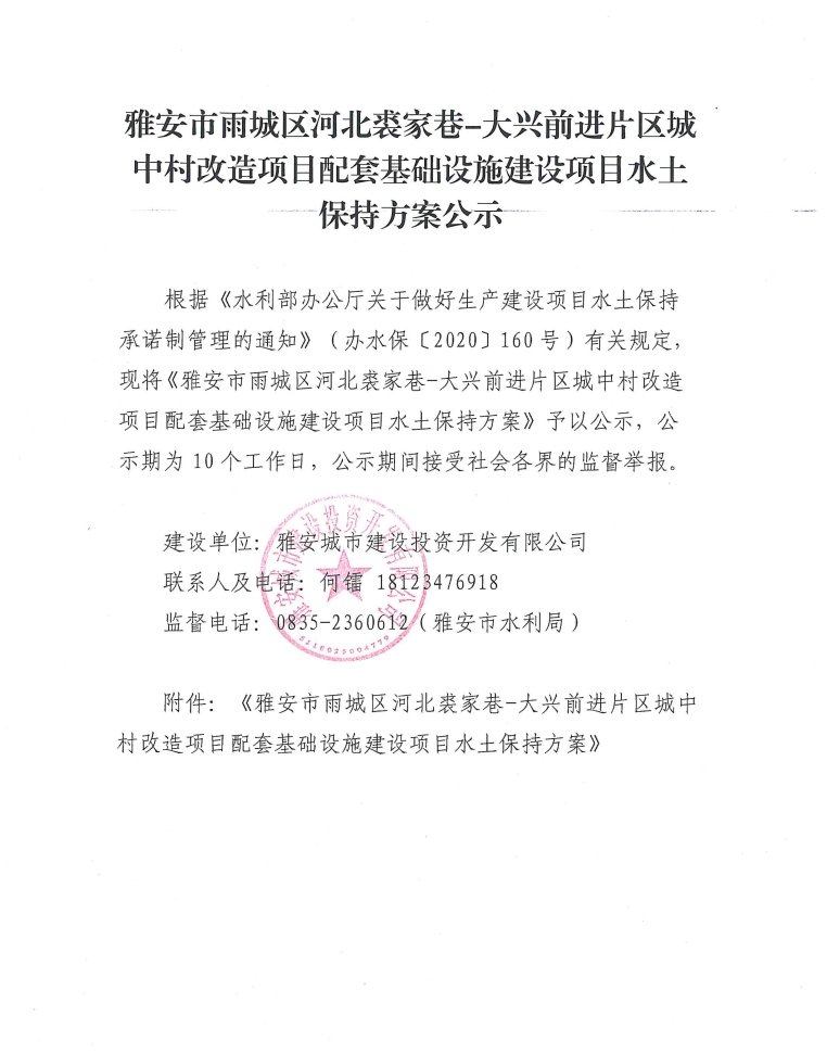 雅安市雨城區(qū)河北裘家巷-大興前進片區(qū)城中村改造項目配套基礎設施建設項目水土保持方案公示