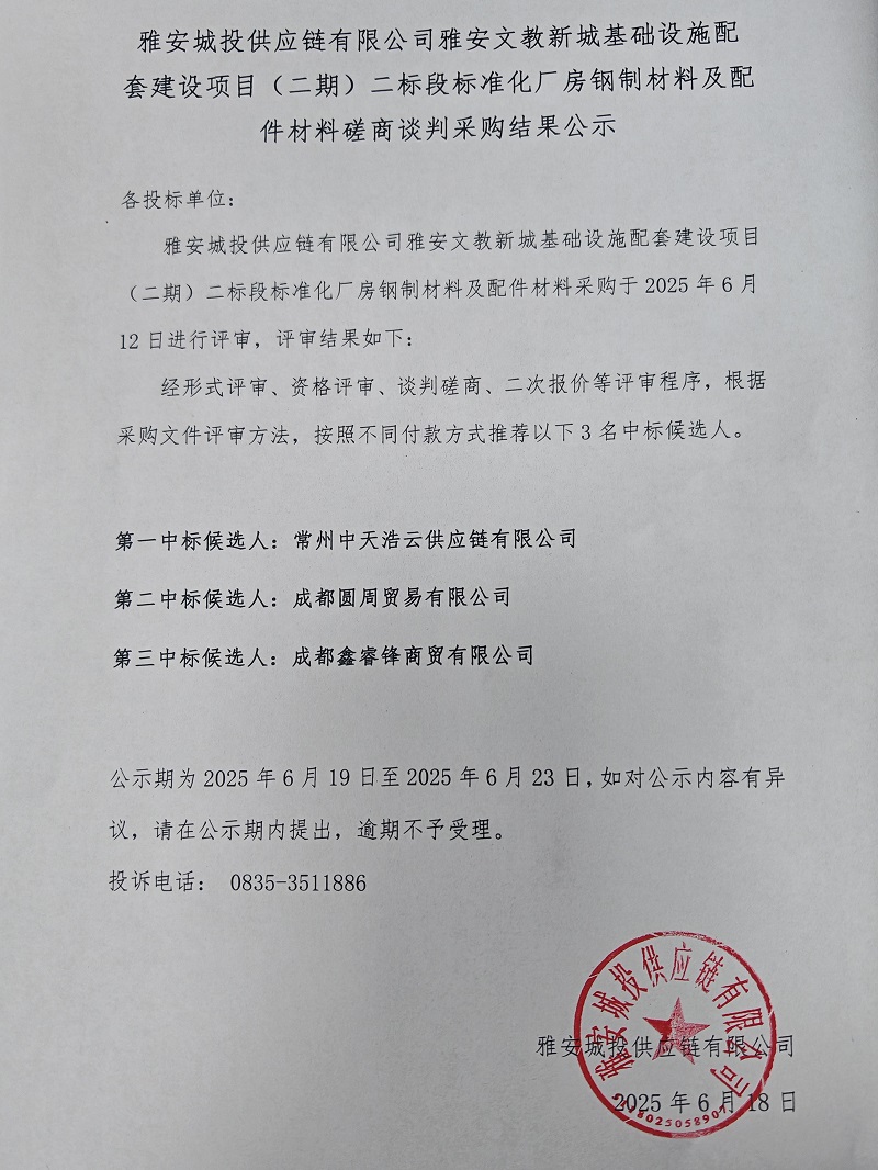 雅安城投供應(yīng)鏈有限公司雅安文教新城基礎(chǔ)設(shè)施配套建設(shè)項(xiàng)目(二期)二標(biāo)段標(biāo)準(zhǔn)化廠房鋼制材料及配件材料磋商談判采購(gòu)結(jié)果公示