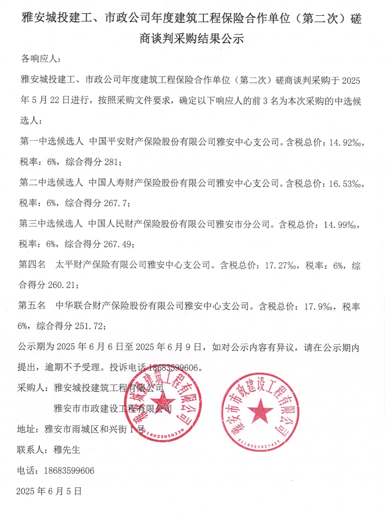 雅安城投建工、市政公司年度建筑工程保險(xiǎn)合作單位(第二次)磋商談判采購(gòu)結(jié)果公示