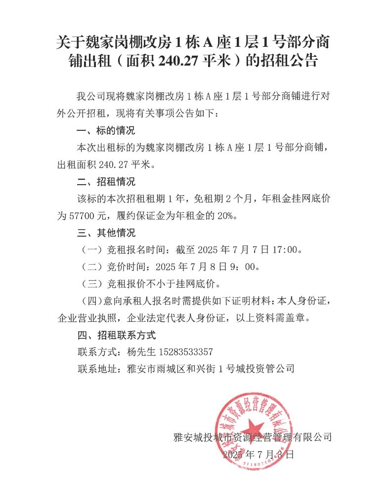 關(guān)于魏家崗棚改房1棟A座1層1號(hào)部分商鋪出租(面積240.27平米)的招租公告