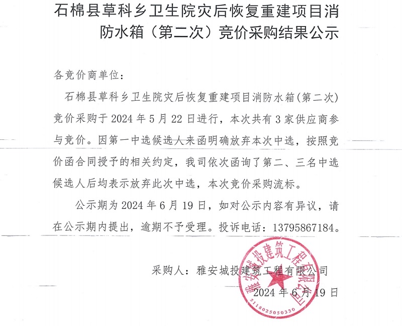 石棉縣草科鄉(xiāng)衛(wèi)生院災(zāi)后恢復(fù)重建項(xiàng)目消防水箱(第二次)競價采購結(jié)果公示