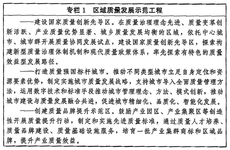 (九)打造區(qū)域質(zhì)量發(fā)展新優(yōu)勢。加強(qiáng)質(zhì)量政策引導(dǎo),推動區(qū)域質(zhì)量發(fā)展與生產(chǎn)力布局、區(qū)位優(yōu)勢、環(huán)境承載能力及社會發(fā)展需求對接融合。推動?xùn)|部地區(qū)發(fā)揮質(zhì)量變革創(chuàng)新的引領(lǐng)帶動作用,增強(qiáng)質(zhì)量競爭新優(yōu)勢,實現(xiàn)整體質(zhì)量提升。引導(dǎo)中西部地區(qū)因地制宜發(fā)展特色產(chǎn)業(yè),促進(jìn)區(qū)域內(nèi)支柱產(chǎn)業(yè)質(zhì)量升級,培育形成質(zhì)量發(fā)展比較優(yōu)勢。推動?xùn)|北地區(qū)優(yōu)化質(zhì)量發(fā)展環(huán)境,加快新舊動能轉(zhuǎn)換,促進(jìn)產(chǎn)業(yè)改造升級和質(zhì)量振興。健全區(qū)域質(zhì)量合作互助機(jī)制,推動區(qū)域質(zhì)量協(xié)同發(fā)展。深化質(zhì)量強(qiáng)省建設(shè),推動質(zhì)量強(qiáng)市、質(zhì)量強(qiáng)業(yè)向縱深發(fā)展,打造質(zhì)量強(qiáng)國建設(shè)標(biāo)桿。